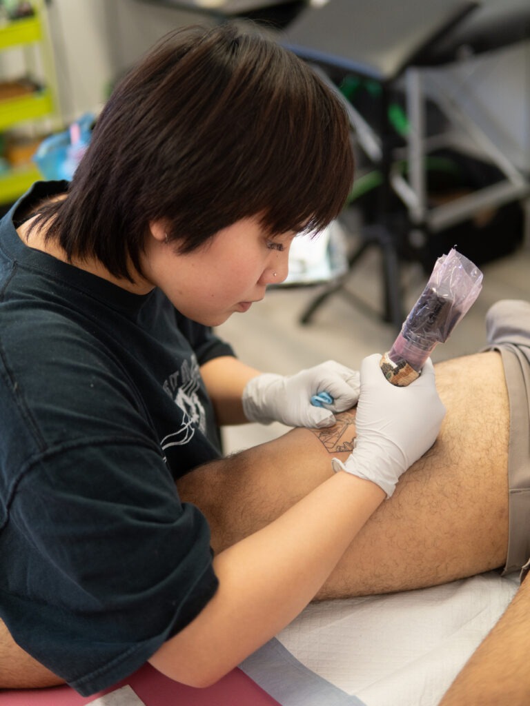 Ezgi is a Seattle-based pixel tattoo expert. Born n’ raised in the midwest, they love everything from massive technical challenges to small cute ‘lil bangers! Video game + anime, nerdy things are common subject matter in their work, but they thrive with variety.